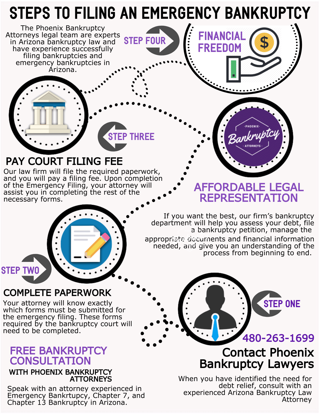 We realize that no one wants to file for bankruptcy. However, sometimes it is the best move for a particular financial situation. Find out if you are in a financial situation that may require an Arizona emergency bankruptcy filing. Filing an Emergency Bankruptcy provides you protection from creditors as the Automatic Stay is invoked immediately and all creditor collection action must cease.