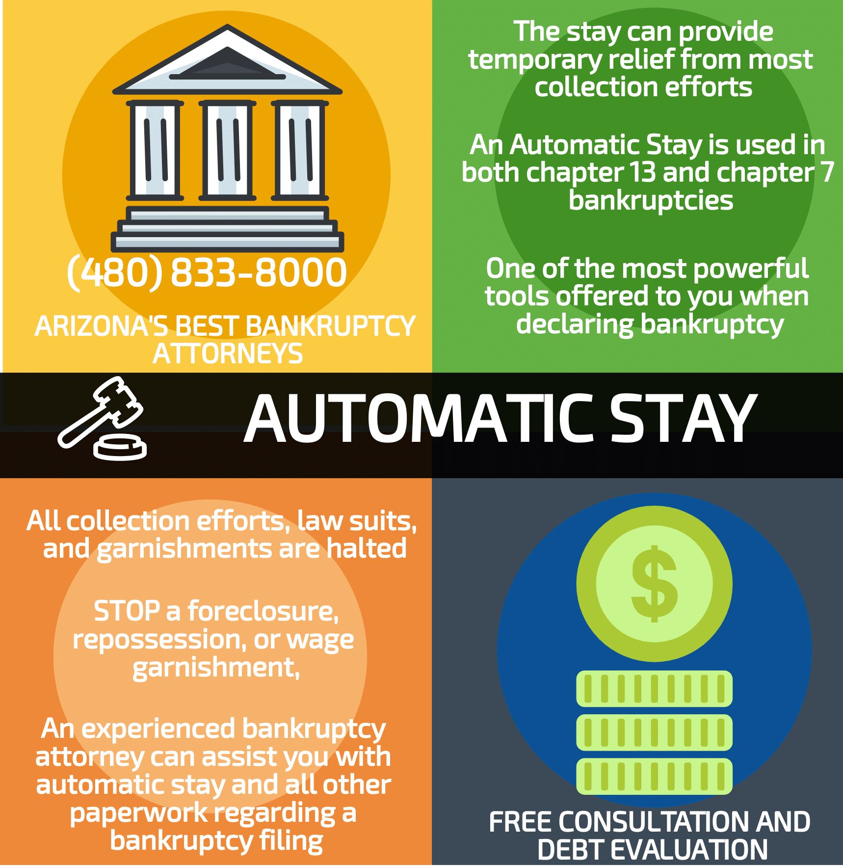 What exactly is The Automatic Stay? The Automatic Stay is just that, a stay. While a stay is not permanent the stay can provide temporary relief from most collection efforts. The stay goes into effect the moment that a bankruptcy case is filed. The automatic stay remains in place until the bankruptcy is either discharged, dismissed, or the creditor files and is successfully granted a motion to lift the stay. The stay is awarded in both Chapter 7 and Chapter 13 bankruptcy filings.The Automatic Stay will stop most actions, but not all. Certain things like child support, criminal restitution, divorce proceedings, taxes, and some evictions cannot be stalled by the Automatic Stay. It is important to speak with a lawyer to determine if the Automatic Stay will help your particular situation.