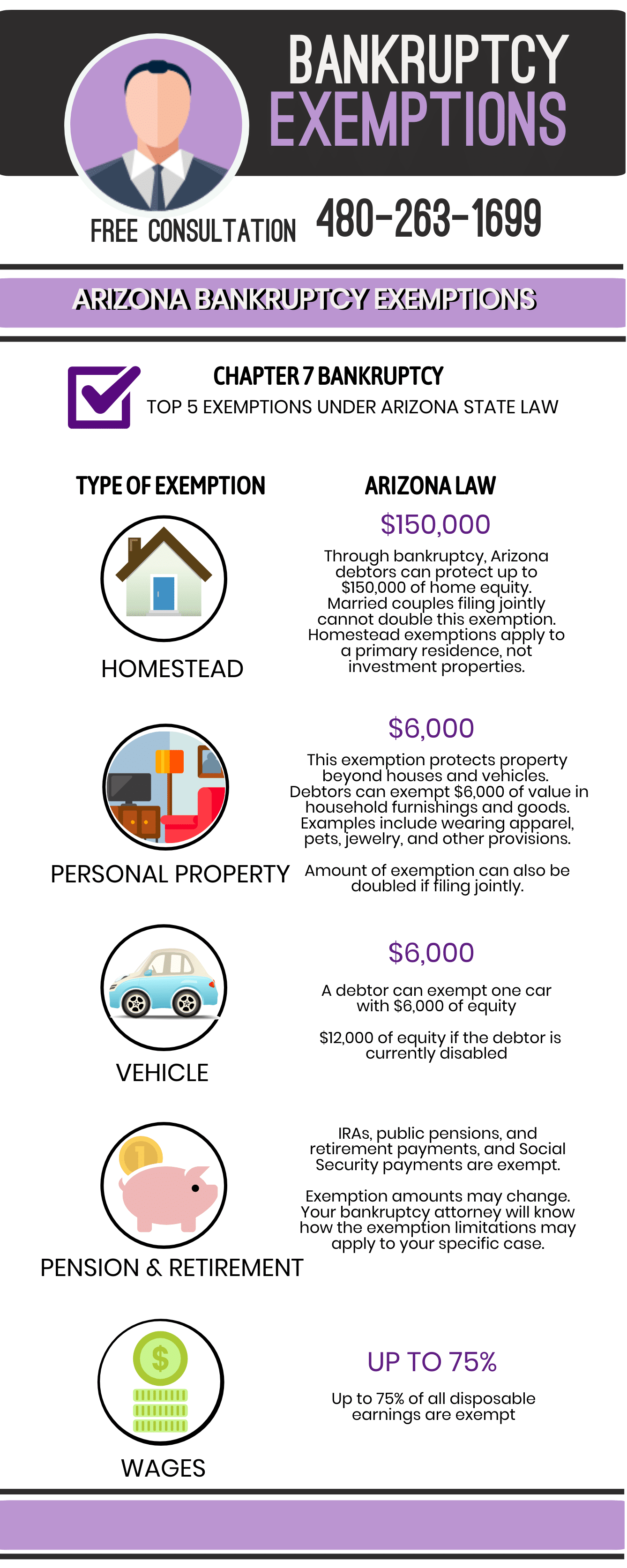 To get a better understanding of filing for bankruptcy protection, the differences between Chapter 7 and Chapter 13 bankruptcy, and what things might be exempted while filing for bankruptcy, contact an Arizona bankruptcy lawyer for a free consultation. Call (480) 263-1699 and get yourself on the road to a “Fresh Start” right away.