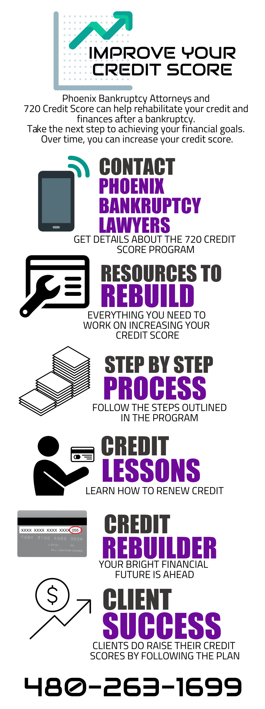 Phoenix Bankruptcy Attorneys has partnered with 720 Credit Score, a leading credit recovery company. We also offer a program that is solid education in credit score rehabilitation. Clients who follow this step-by-step format typically see a 720 credit score within 1-2 years of filing for bankruptcy.