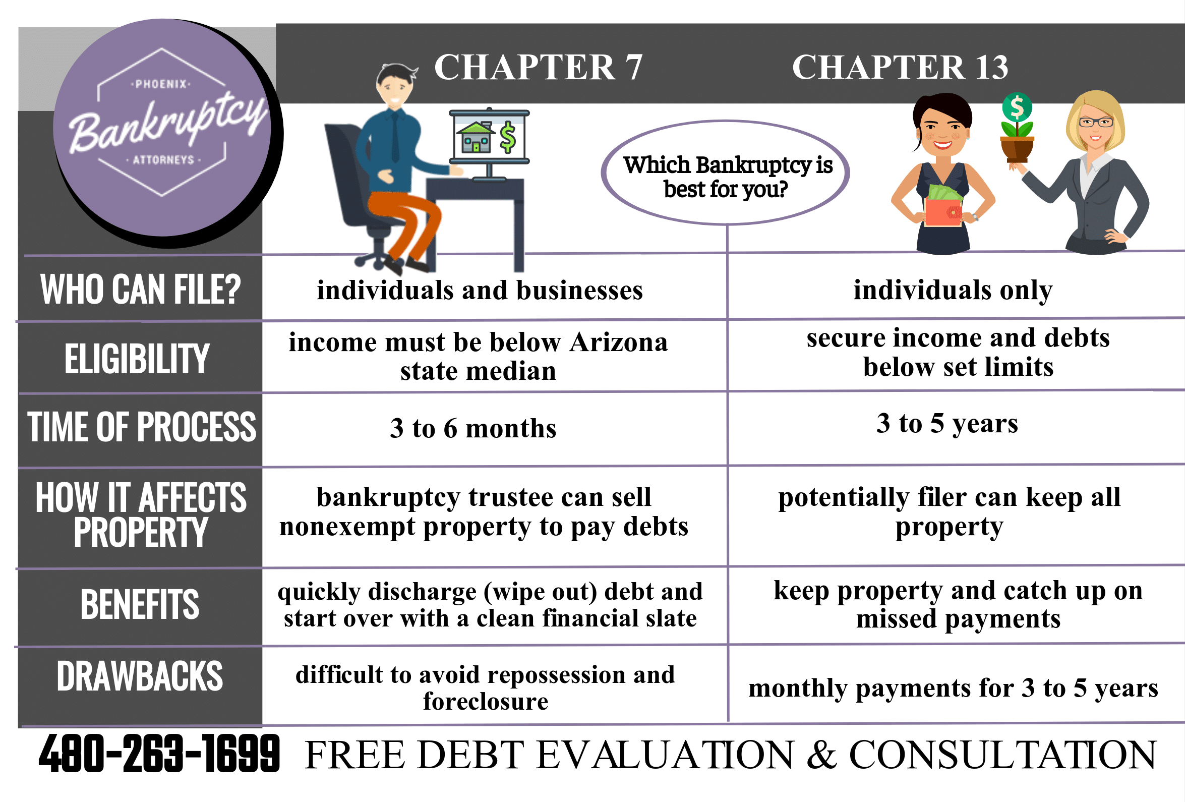 Attorneys dedicated to exceptional legal representation have helped thousands of Phoenix residents eliminate or reduce debt. Chapter 7 and Chapter 13 bankruptcy are both viable options to many debt-related financial issues. Consult with an attorney at Phoenix Bankruptcy Lawyers to find out which filing is best for your unique debt case, and to get information on your rights as a debtor as well as debt-relief options.
