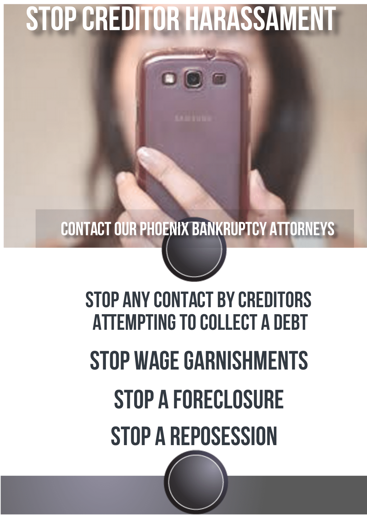 Filing a bankruptcy petition can not only stop a repossession, but also end collection activity by creditors. When the constant attempts by creditors to call or contact you becomes unbearable, it may be time to put a stop to the harassment. The automatic stay goes into effect when a bankruptcy is filed. This means that no creditor can contact you anymore. No creditor can sue you or bring a law suit against you for the debt. No more threats by creditors. You have rights as a debtor, and Phoenix Bankruptcy Lawyers will help you understand how you can use the Arizona Bankruptcy Code to help you in your debt relief efforts.