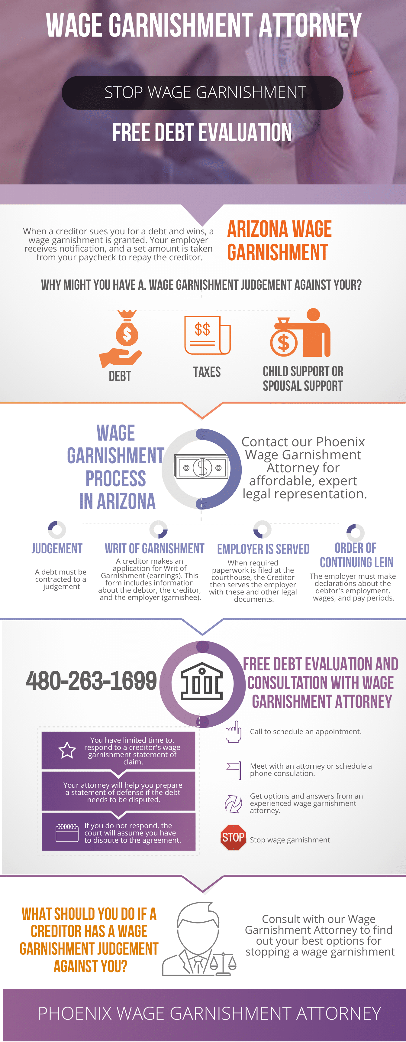 You may not be able to afford wages being taken from your paycheck. Consult with our Phoenix wage garnishment attorney and schedule a free consultation to get answers about a wage garnishment judgement against you.